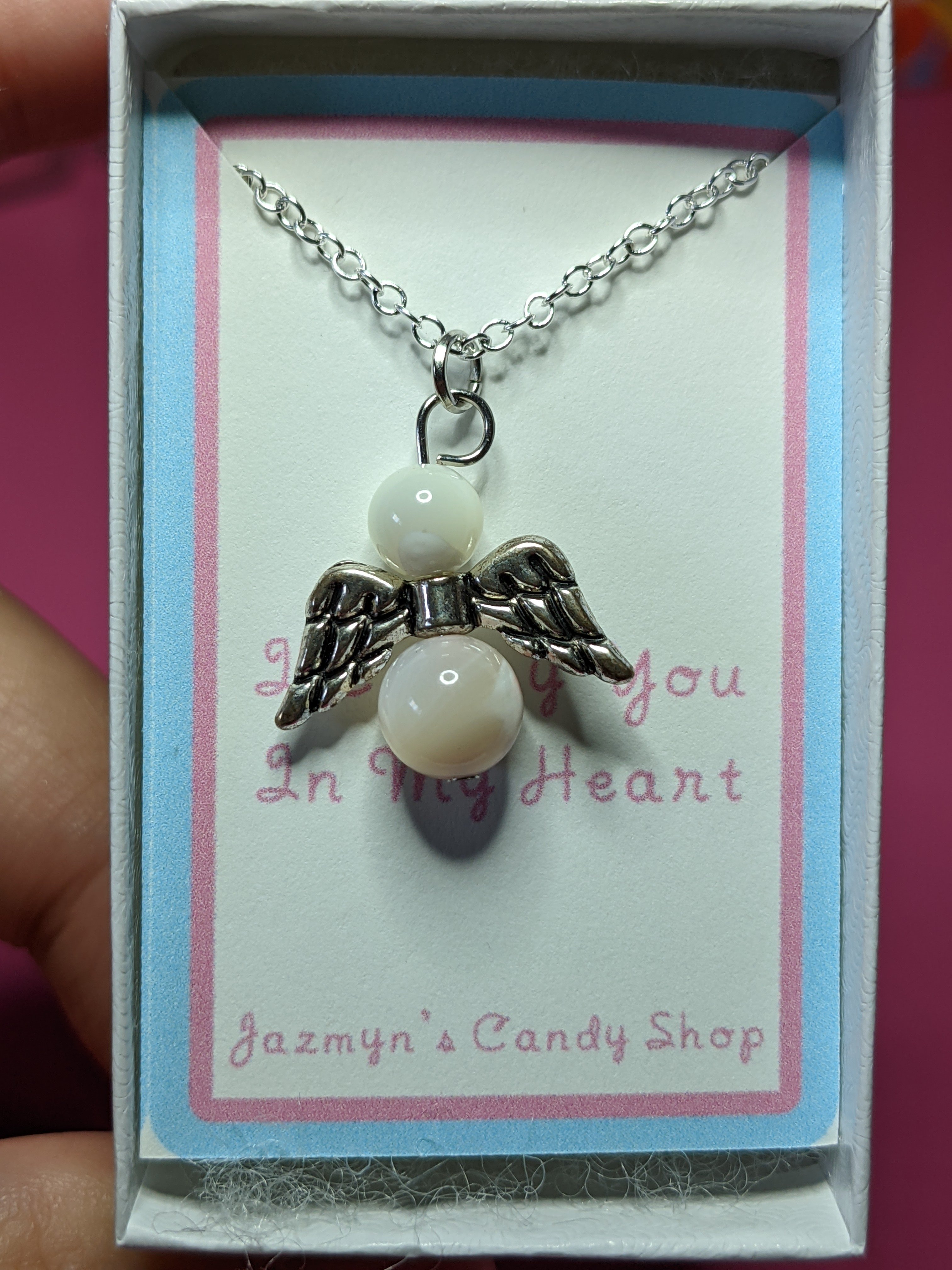 This beautiful necklace is to help families memorialize and honor their babies that were lost during pregnancy or infancy. The head and body of the angel is made from mother of pearl. The necklace is made of silver plated copper.